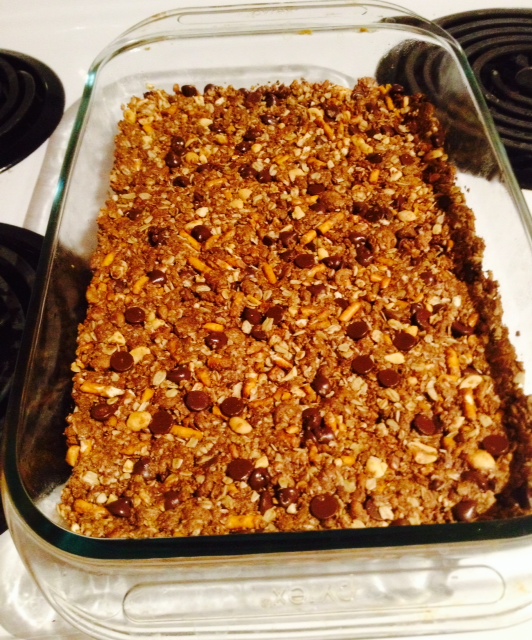 Mix all of the dry ingredients except the chocolate chips together in a large bowl. Add peanut butter and stir until the mixture is well combined (I like to use my KitchenAid mixer with paddle attachment for this; before I had one I just used my hands). Add the honey and vanilla and mix again. You may need to add more honey if you feel like the mixture won’t stick together to form the bars. Stir in the chocolate chips. Spray a 9×13 baking dish with cooking spray and press the mixture firmly into the dish, packing it down well.