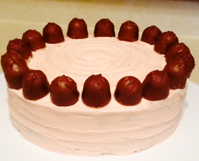 Place one cake layer down and spread cordial filling evenly on it. Place second cake layer down and do a very thin coat of whipped frosting. Place in the fridge for 15-30 minutes to harden the crumb coat, the pull back out and finish frosting. Use chocolate covered cherries to garnish. I placed them all around the edge of the cake. Keep cool and take out about an hour before serving. This cake stays moist for days.