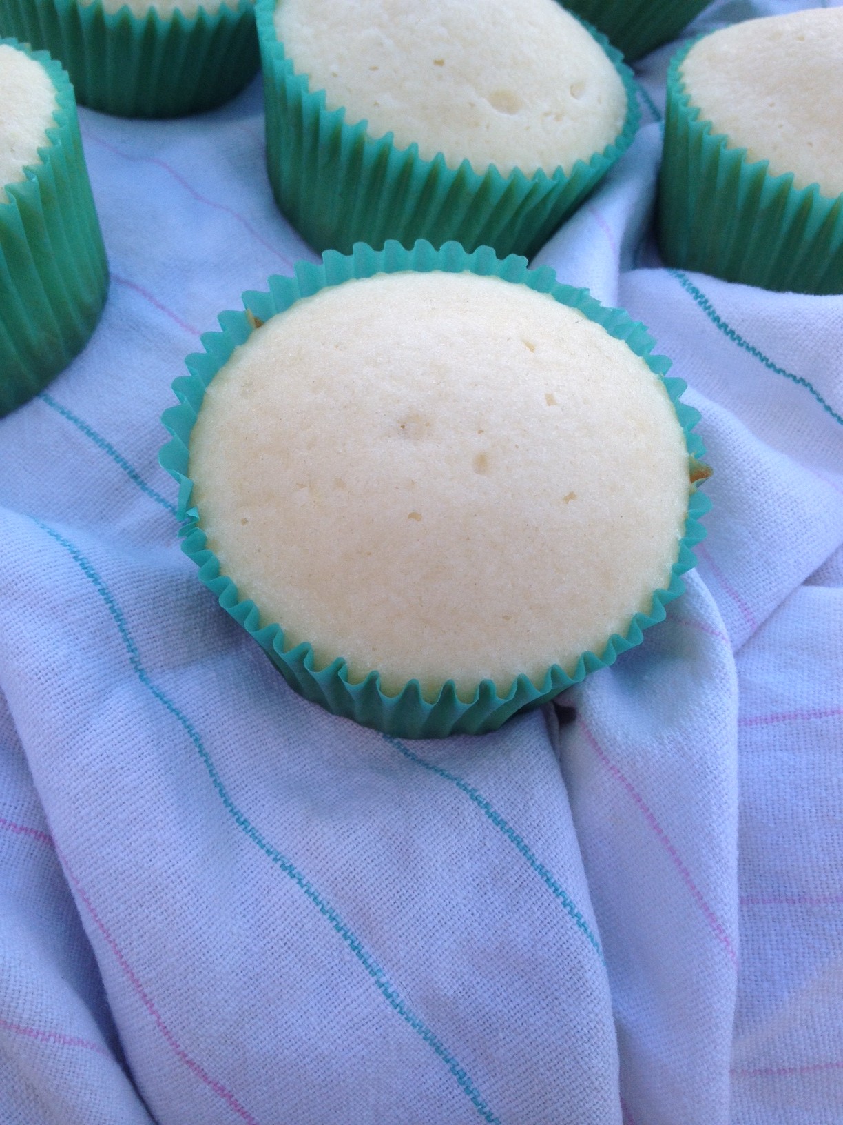 This recipe uses a mixture of all-purpose flour and cake flour and it also uses an unusual way of mixing. You chop your butter into pieces and add them in small batches to the mixture of all of the dry ingredients. The milk gets added last. This method is from the Cake Bible and is apparently a way to avoid over mixing. The batter smelled and tasted great and the texture of it was really perfect. I put them in the oven and they baked up perfectly too. Visually the nicest cupcakes I’ve made so far.