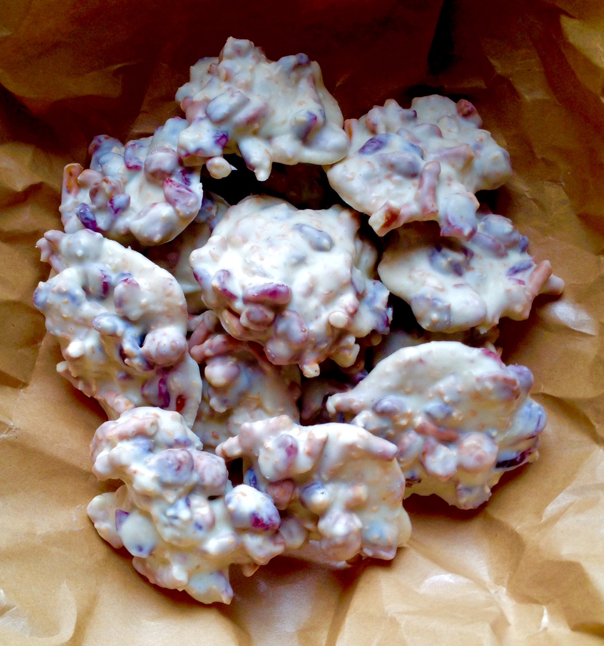 This is the other creation I teased you with last week on my holiday baking list. I’ve recently become totally obsessed with making chocolate bark. So easy to make, and the combinations are endless. I decided to do a holiday take for my Christmas baking and came up with this one. Creamy white chocolate is dotted with festive dried cranberries and toasted coconut. You also get a little salty-sweet crunch from honey roasted peanuts and pretzels. These no-bake drops are rustically beautiful and will add something different to any cookie tray this season.