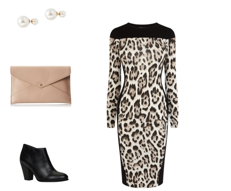 For night, I paired this gorgeous leopard dress with an ankle boot and a blush clutch, although I’d be adding tights in this cold weather. I’ve been really wanting a pair of double sided earrings just like those ones and I liked the edginess they added. I think the gold watch would fit in just well with the night look for a glam touch.