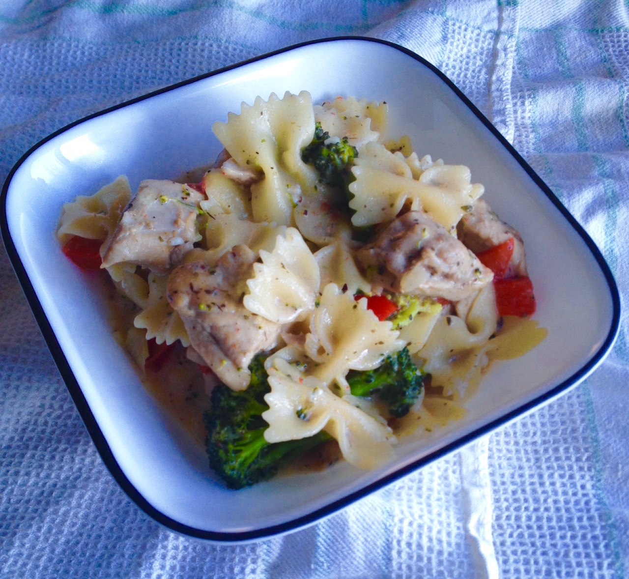 Heat oil in a large pot over medium heat. Once hot, add chicken chunks and season them with seasoning salt, pepper and Italian seasoning. Fry chicken until just cooked through, then add the onion and garlic and sauté a few more minutes until fragrant. Add 1 1/2 cups of stock, the half and half and the dried pasta. Stir, making sure the pasta is mostly covered with liquid. You can add the remaining ½ cup stock if it seems too dry. Layer the broccoli and red pepper on top of the pasta and bring mixture to a boil. Put a lid on the pot and turn the heat down to simmer. Cook for 10-15 minutes until pasta is al dente. Remove the pot from the heat, stir in feta cheese and let stand a few minutes with the lid on to thicken up the sauce. Taste and add additional salt & pepper if desired. Serve!
