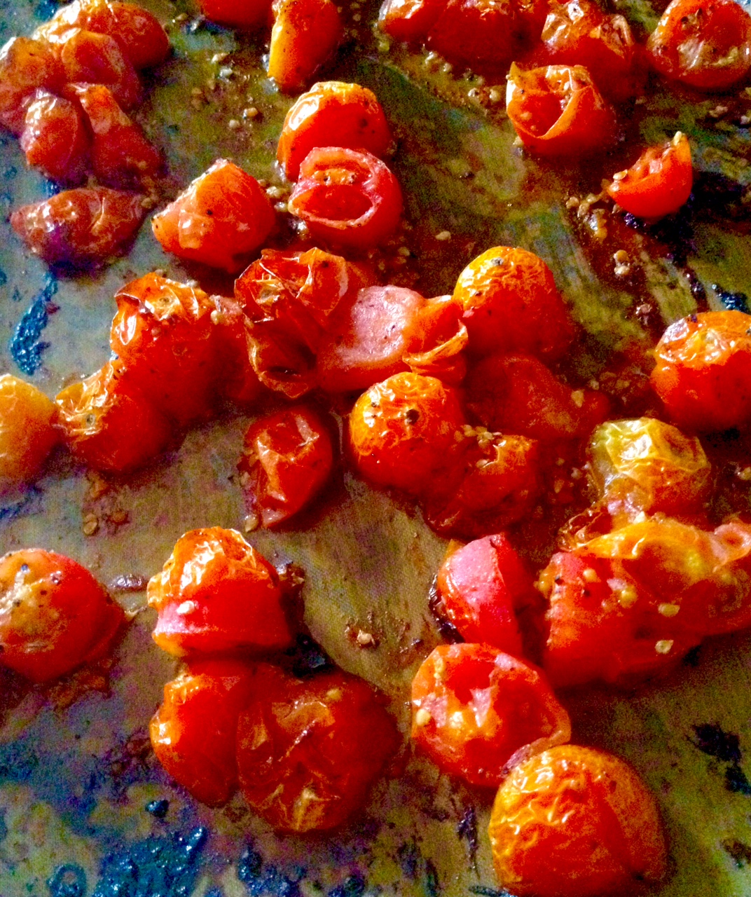 If I roast them with olive oil they get all sweet and delicious and then I like them a lot and want them on everything. I know this is hardly a recipe but it’s so easy to keep a batch of these in the fridge and add them to salads and pastas and pop them into your mouth one by one like grapes.