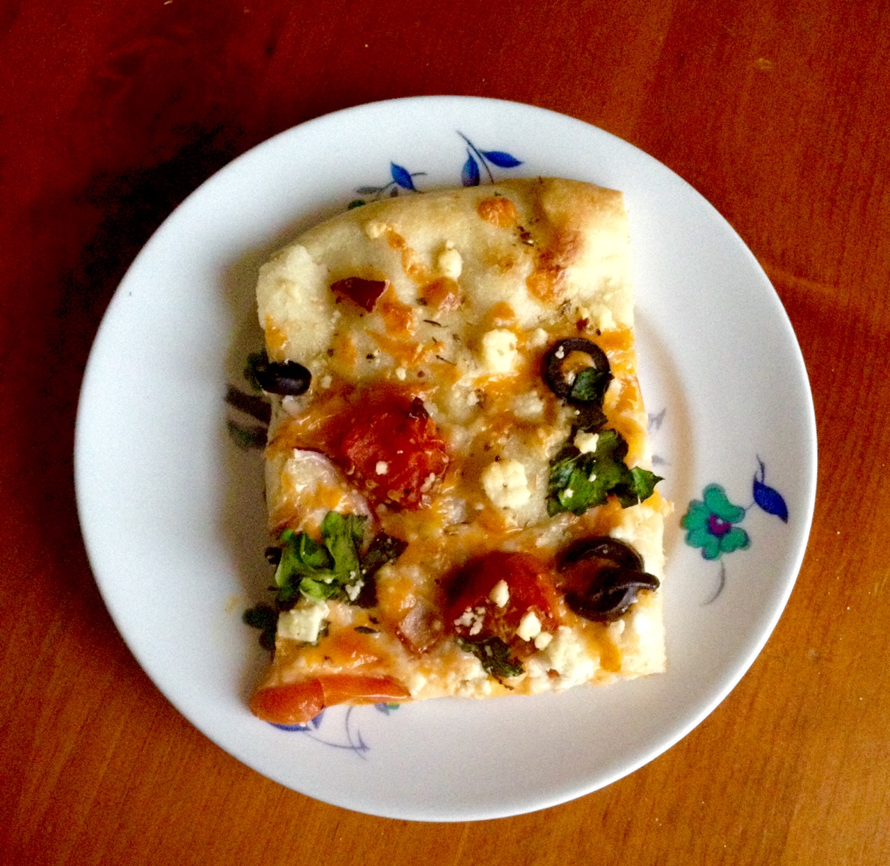 Salty olives and feta, sweet red onion and roasted cherry tomatoes and a heavenly sauce that tastes a little like Caesar dressing…this one has everything you want in a veggie pizza. My Dad may never open his own shop but at least now you can get an idea of why I brag about his pizza all the time. Do it!