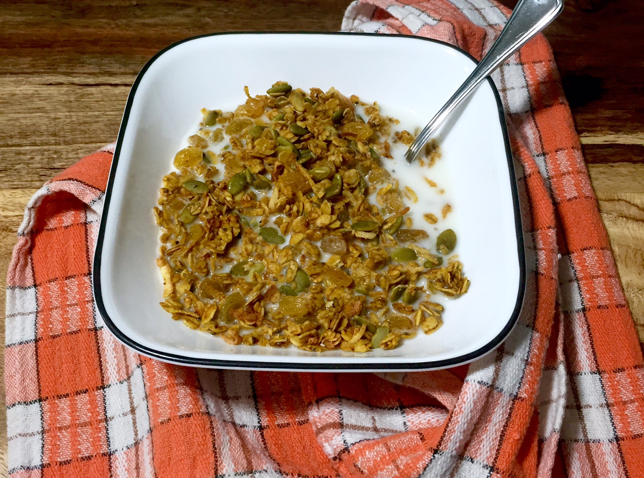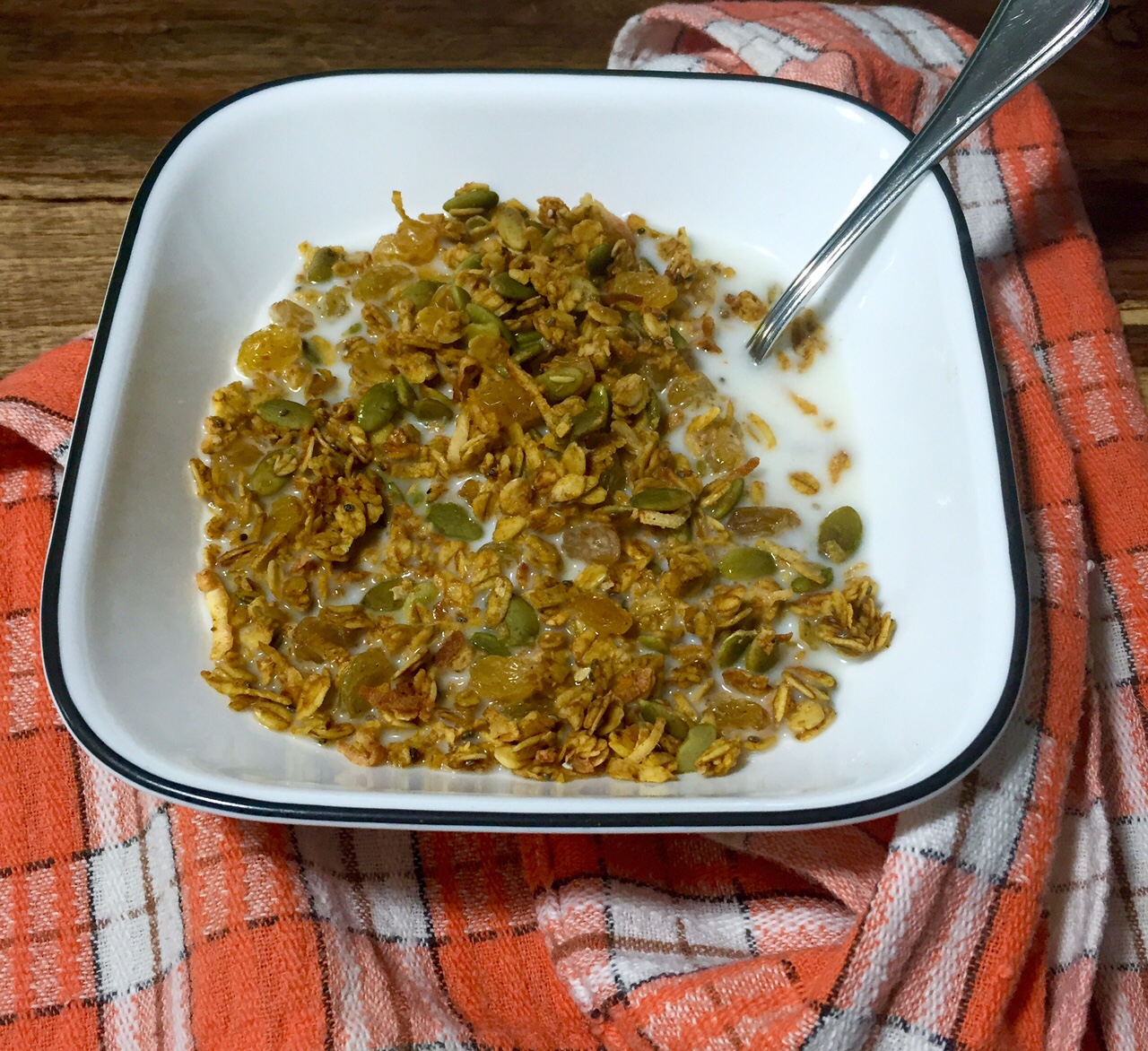 This granola is not too sweet and nicely spiced. The pumpkin seeds and chia add great crunch alongside the chewy raisins. I poured some coconut milk over my bowl and loved every single bite.